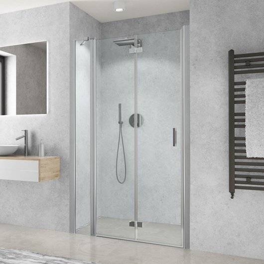 Tieto dvere majú profily z ušľachtilého hliníka v prevedení Brillant. Výplne bezpečnosních skiel ponúkame v nadčasovom prevedení Transparent (číre sklo). Produkt disponuje skladacími dverami, vďaka ktorým si zaistíte ešte širšie a pohodlnejšie vstup do sprchy. Skladacie dvere je možné zložiť úplne k stene vďaka otočným stenovým profilom.